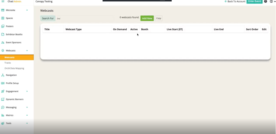 - To create new webcasts, go the ‘Webcasts’ section and assign them to tracks during creation