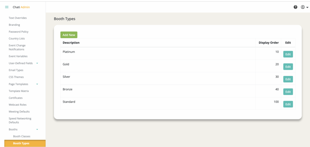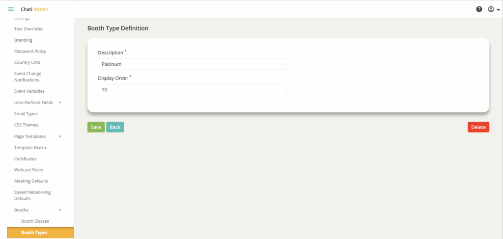 Booth Types in Chati allow you to group spaces and entitle those groups through registration packages. This is particularly useful when you want certain attendee packages to access specific exhibitor areas.