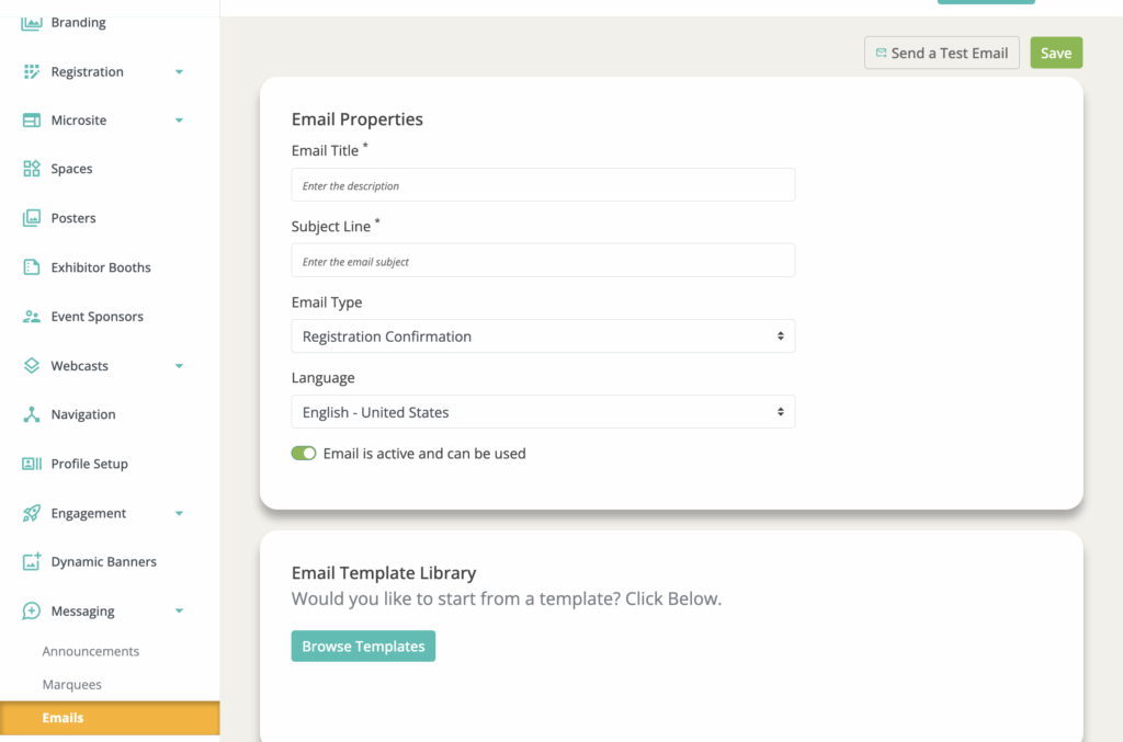 - Select the email type “Registration Confirmation” (If you don’t, you won’t be able to select the email in the registration package)