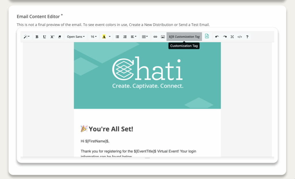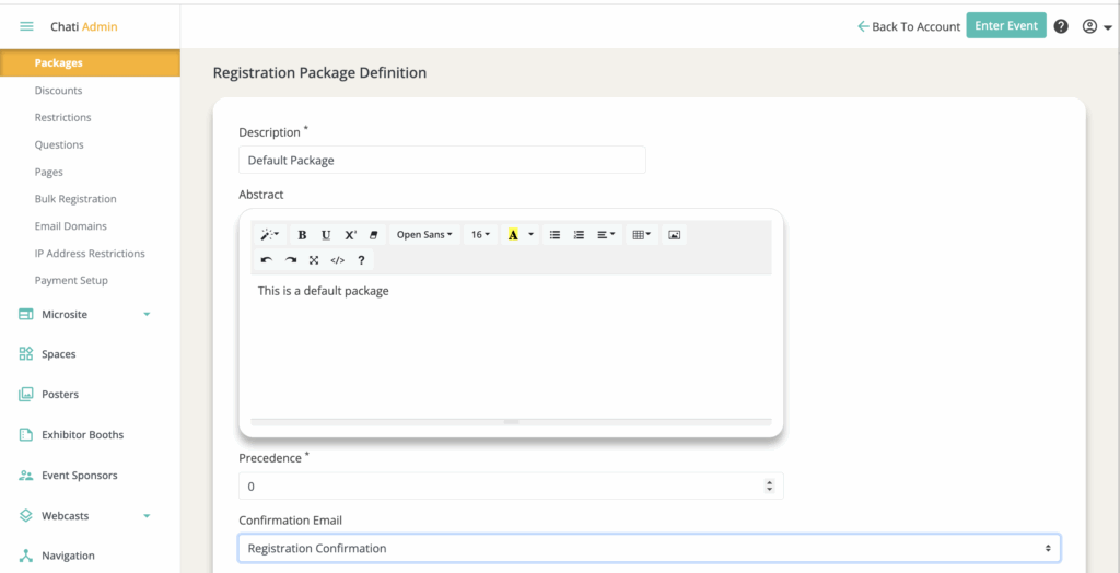 Each registration package in Chati can have its own customized confirmation email. This allows you to send targeted, package-specific information to attendees based on their registration type. Registration confirmation emails are automatically sent to users after they register.