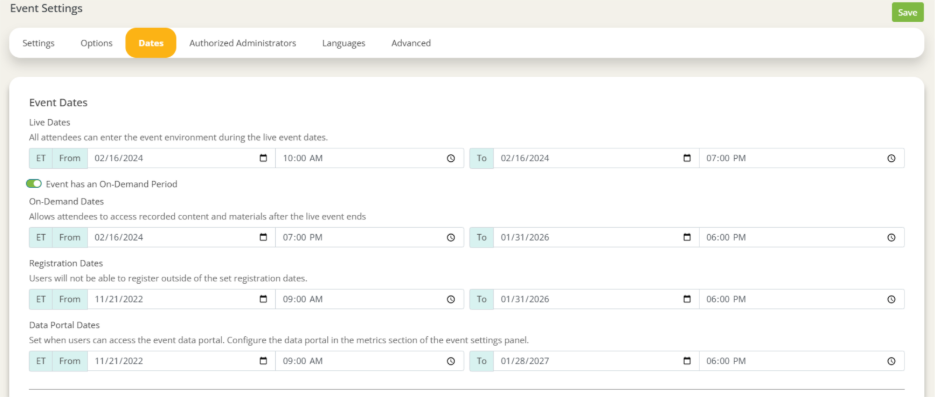 A. Toggle ‘Only admit booth and webcast staff during preview period’ to on or off. This setting will only allow users added as staff in spaces, booths, or webcasts the ability to enter the event during the preview period.