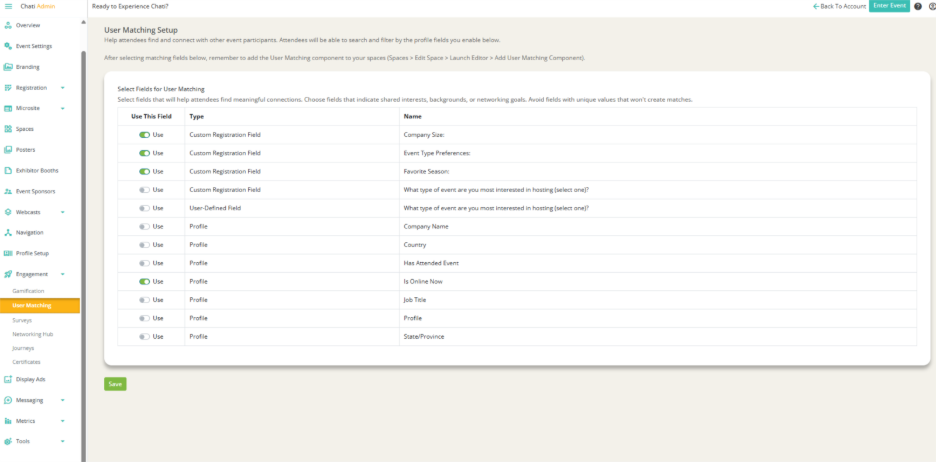 3. Click ‘Engagement’ on the Event Settings Panel, then ‘User Matching’